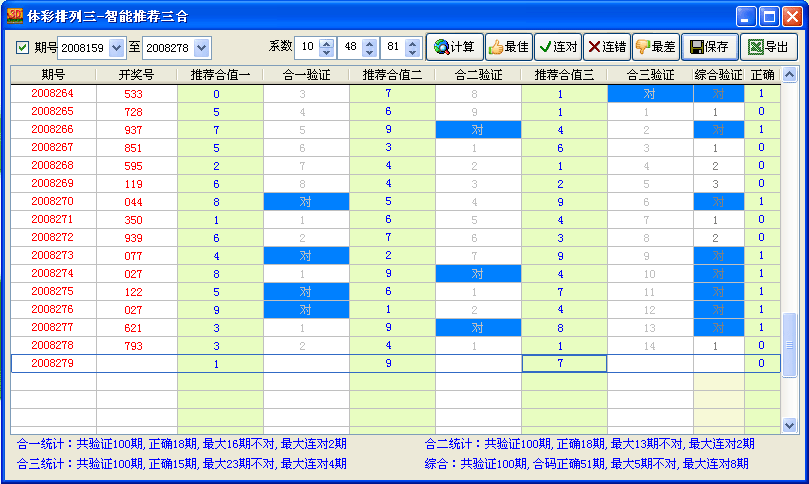 最佳参数按钮:可以让你快速找出当前推荐合值最佳的系数。找出来的系数只表示过去统计范围中效果最好的系数,并不代表未来的预期。此按钮功能就是要让您去把握高中奖率公式的热态走势。一个高中出率的推荐结果出来后,肯定不会那么快走冷,按热态公式参考3-5期,必有收获。隔一定期数后再重新扫描,又可去参考最新的高中出率公式,依此类推。